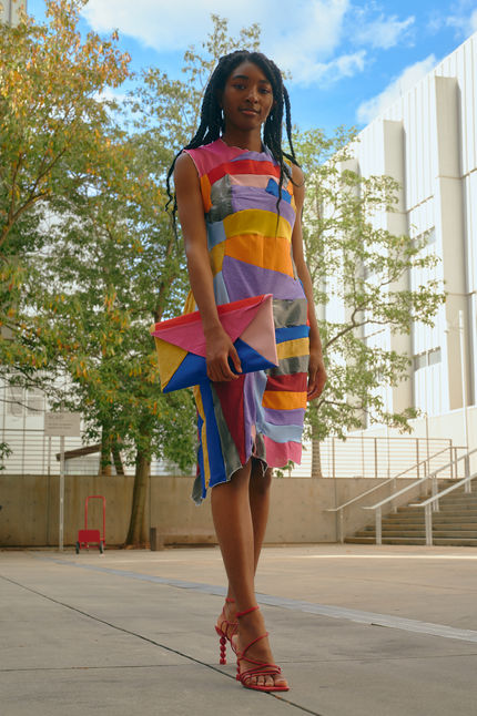My concept was to take fabrics and garments and fuse them together in order to create a collage of clothing as a garment, just as you would with taking scraps of paper to create a collage. Each garment had different shapes, sizes, textures, weights, and colors of fabrics. I pieced them together like a puzzle to create garments. The fabrics used to create my pieces are sustainable, as I only worked with textile waste and recycled scrap pieces as a material base. These fabrics are sustainable because I used clothes from thrift stores as well as old garments to that were taken apart and reused.